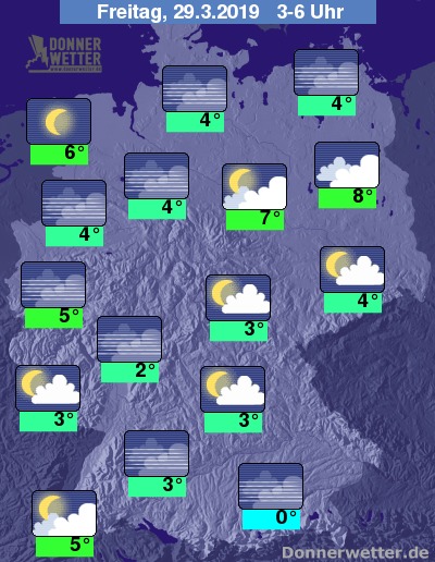 Bis zu den Frühstunden kühlt die Luft auf 2 Grad im Rhein-Main-Gebiet und 8 Grad unter den dichteren Wolken rund um Berlin ab. Im Alpenvorland kann es leichten Frost geben.