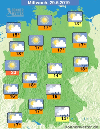 Die Höchsttemperaturen liegen allgemein zwischen 13 und 19 Grad, am kühlsten bleibt es dabei an der Ostsee. In den Ballungsgebieten des Westens kann sich die Luft dank längerer Sonnenscheindauer auf 20 bis 23 Grad erwärmen.