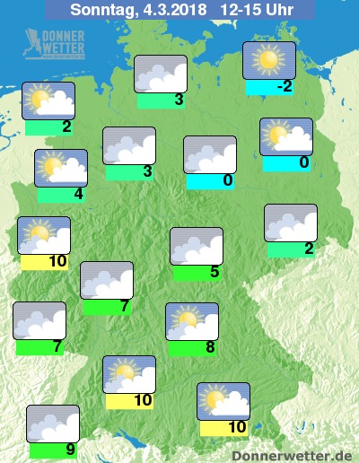Heute Nachmittag scheint im Nordosten und im Nordseeumfeld verbreitet die Sonne, im übrigen Land ist es überwiegend stark, vor allem im Südosten aber auch zum Großteil nur locker bewölkt, dabei bleibt es weitgehend trocken. Die Temperatur liegt bei -2 bis 10 Grad.