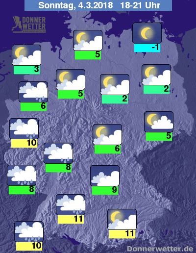 Heute Abend bringen kompakte Wolken dem Westen und Südwesten zeitweiligen Regen, weiter nach Osten hin ist es angrenzend meist stark, vor allem in den östlichen Landesteilen meist locker bis wechselnd bewölkt, dazu bleibt es hier trocken. Die Temperatur liegt bei -1 bis 11 Grad.