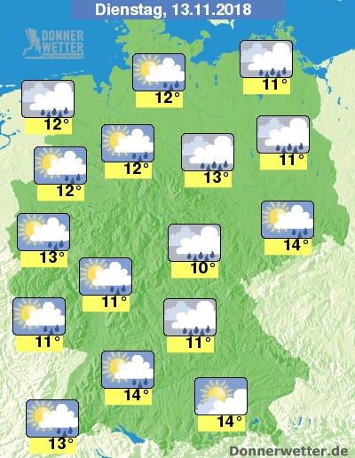 Am Dienstag zieht ein Tiefausläufer von West nach Ost über Deutschland hinweg, dabei fällt bei starker Bewölkung zeitweise Regen, vor und nach dem Regenband ist es zwar ebenfalls mehrheitlich stark, teils aber auch aufgelockert bewölkt und dazu weitgehend trocken. Die Temperatur steigt auf milde 10 bis 14 Grad.