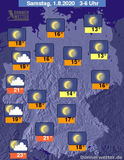 Die Tiefstwerte bewegen sich in der Nacht im Südwesten und Westen - hier vor allem in den Ballungszentren - auf Tropennacht-Nivau und sinken teils nur auf Werte um 23 bis 21 Grad ab. In den übrigen Landesteilen und besonders im Nordosten lässt es sich bei Werten um 19 bis 13 angenehmer schlafen.