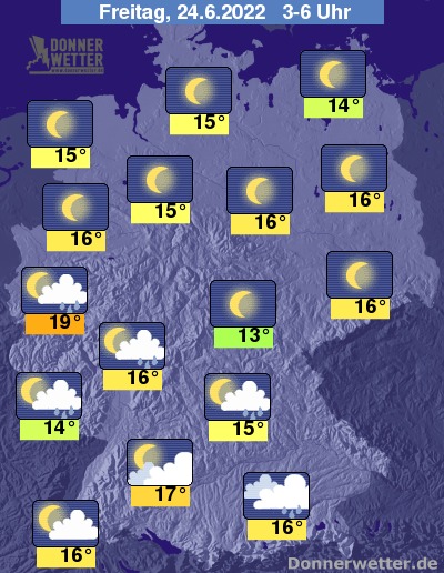 In der bevorstehenden Nacht bleibt der Himmel über der Nordosthälfte sternenklar. Im Süden und Westen zieht jedoch oft starke, teils lockere bis aufgelockerte Bewölkung durch, es können sich einzelne Schauer, selten auch Gewitter bilden. Die Temperatur sinkt auf sehr milde 19 Grad in Köln und bis 13 Grad in Jena.