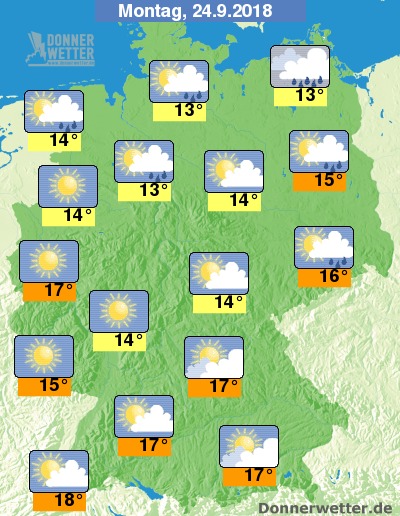 Am Montag zeigen sich häufig heitere bis sonnige Abschnitte, hier und da können aber auch einige, selten auch dichte Wolken durchziehen, dabei sind jedoch nur selten Schauer möglich. Die Temperatur erreicht 13 Grad an der Ostsee und bis 18 Grad im Breisgau. An der Nordsee weht ein teils starker bis stürmischer Wind.