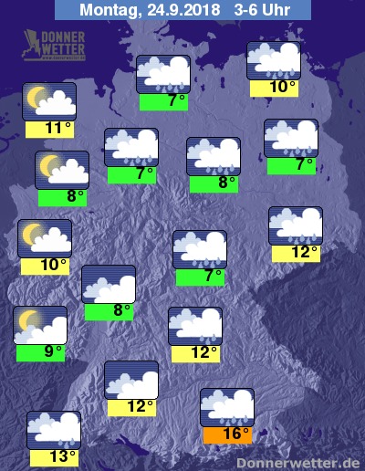In der bevorstehenden Nacht bleibt es zunächst weitgehend dicht bewölkt und im Süden bilden sich gebietsweise Schauer und örtliche Gewitter, weiter nach Norden hin fällt häufig, zum Teil starker und gewittriger Regen. Im Laufe der zweiten Nachthälfte lockert es von Westen her auf und die Niederschläge klingen ab. Über der Osthälfte fällt jedoch bis zum Morgen hin weiterhin zeitweise Regen. Die Temperatur sinkt auf 16 Grad in München und bis 7 Grad in der Norddeutschen Tiefebene. Der Wind weht in weiten Landesteilen stark bis stürmisch, an der Nordsee herrscht teils Sturm.
