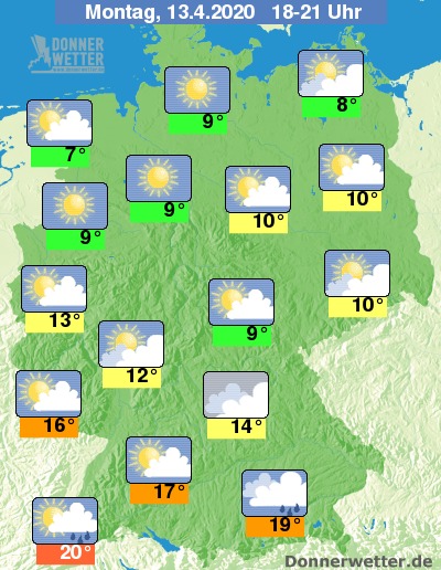 Heute Abend klingen auch die Niederschläge und letzten schwachen Gewitter im Süden nach und nach ab, nur am Alpenrand regnet es gebietsweise noch weiter. Im übrigen Bundesgebiet ist es verbreitet heiter bis sonnig, an den Küsten aber auch wieder oft stärker bewölkt, dazu bleibt es trocken. Die Temperatur liegt bei kühlen 7 Grad in Bremerhaven und bis 20 Grad in Freiburg.