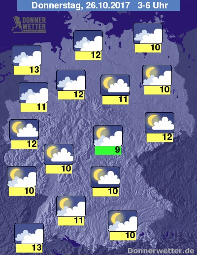 In der Nacht zum Donnerstag zeigt sich der Himmel über dem Nordwesten und Norden des Lands meist stark bewölkt, dazu ist hier und da auch Regen möglich. Im restlichen Land ist es verbreitet locker bis aufgelockert bewölkt und es bleibt trocken. Die Temperatur sinkt auf 13 bis 9 Grad.