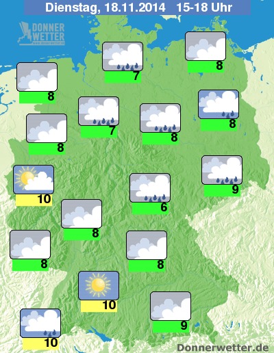 Heute Nachmittag ziehen verbreitet dunkle und dichte Wolken durch, dabei fällt besonders vom Osten über die Mitte bis nach Norddeutschland, teils langanhaltender Regen, in den anderen Regionen bleibt es meist trocken. Im Südwesten des Landes kann sich auch zeitweise die Sonne zeigen, hier bleibt es komplett trocken. Die Temperatur liegt bei 6 Grad im Vogtland und bis zu 10 Grad im Oberrheingraben.