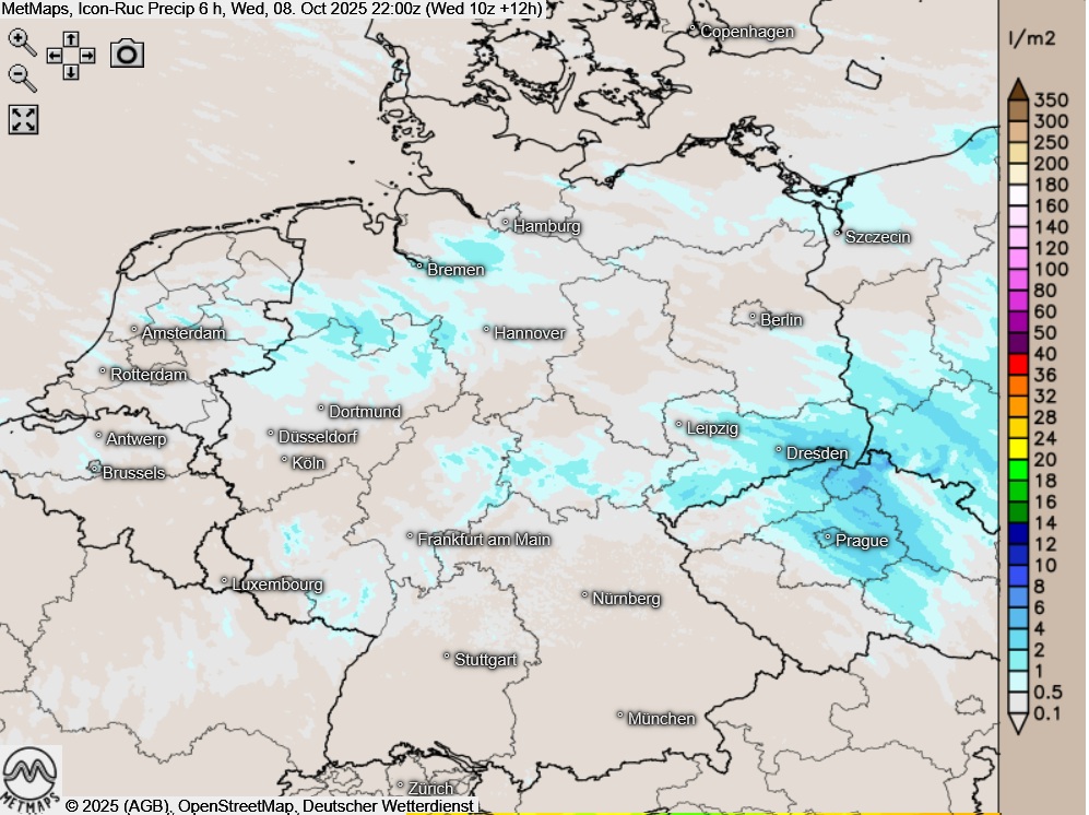 Die Temperaturkarte nach GFS für Mittwochnachmittag sowie die Sechs-Stunden-Regenmengen bis 22:00 Uhr nach Icon-Ruc: