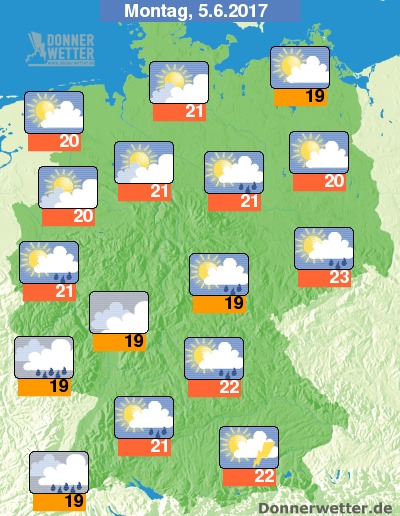 Zum Start in die neue Wetterwoche erwartet uns meist ein Wechsel aus Sonnenschein und teils lockeren, besonders über der Südosthälfte oft auch vielen und speziell am Nachmittag verbreitet dichten Wolken, die hier dann für Schauer und örtliche Gewitter sorgen, sonst bleibt es hingegen meist trocken. Die Temperatur erreicht Werte zwischen 19 und 23 Grad.