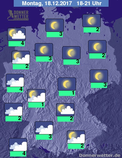 Heute Abend klingen auch die letzten vereinzelten Niederschläge im Südwesten ab, hier bleibt es aber noch meist stark bewölkt. Über der Nordosthälfte zeigt sich der Himmel jedoch weitgehend sternenklar. Teils dichte Bewölkung hält sich hingegen entlang des Rheins und im Alpenvorland, dazu bleibt es aber weitgehend trocken. Die Temperatur liegt bei 1 bis 4 Grad.