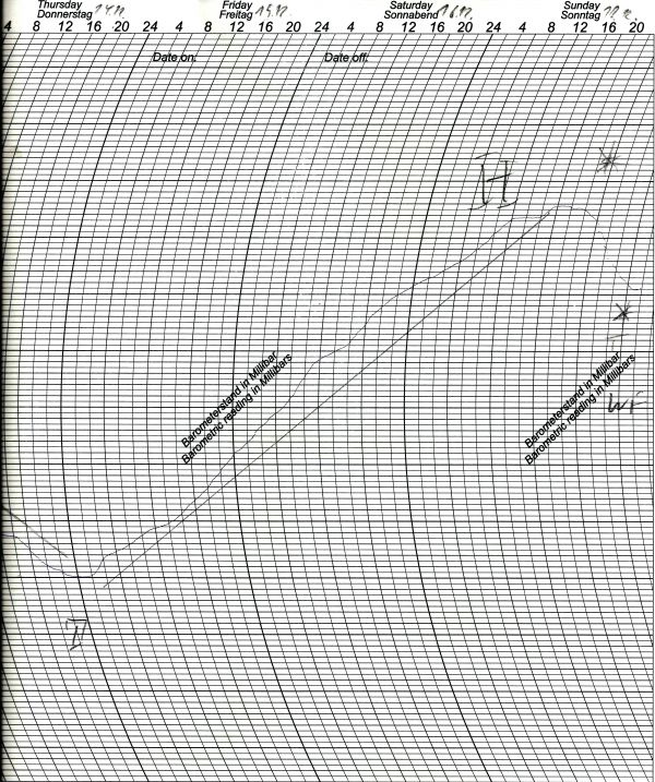 Unser Schrieb zeigt die Luftdruckentwicklung zwischen Donnerstag letzter Woche und Sonntag an unserer Wetterstation in Bonn. Gut zu erkennen ist der kräftig abfallende Luftdruck ab Sonntagmittag / -nachmittag.
