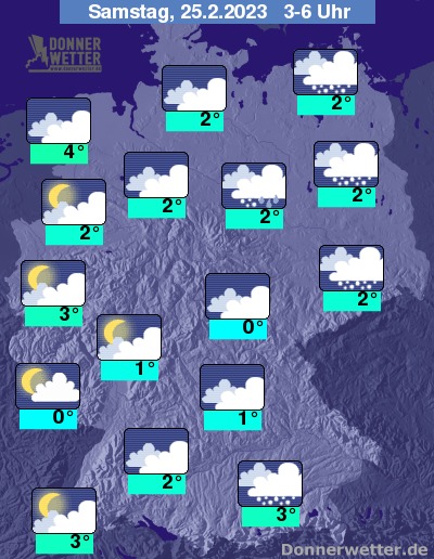 In der folgenden Nacht ist es über dem Westen und Südwesten oft locker bis noch aufgelockert bewölkt und trocken. Im übrigen Land hält sich eine weitgehend verschlossene Wolkendecke und vor allem im Südosten, sowie von Sachsen bis hoch zur Ostsee fällt verbreitet Schnee, zum Teil auch Schneeregen. Die Temperatur sinkt auf 4 Grad in Wilhelmshaven und 0 Grad in Jena. Im Norden und Osten weht ein starker und teils stürmischer Wind, an den Küsten herrscht stellenweise sogar Sturm.