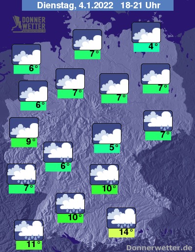 Heute Abend bleibt es weiterhin bedeckt und über dem Süden und über Sachsen fällt verbreitet Regen. Im übrigen Land bleibt es jedoch weitgehend trocken. Die Temperatur liegt bei 4 Grad in Neubrandenburg und bis 14 Grad in München. Im Süden lässt der anfangs noch teils stürmische Wind deutlich nach und weht daraufhin meist nur noch frisch.