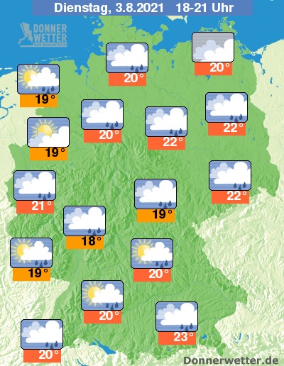Heute Abend ziehen weiterhin oft viele und teils dichte Wolken durch, dabei sind weitere Schauer und örtliche Gewitter zu erwarten. Im Süden bilden sich noch bis spät in den Abend Schauer, während die Schauer und örtlichen Gewitter sonst im weiteren Verlauf immer weiter abklingen. Die Temperatur liegt bei 18 Grad am Westerwald und bis 23 Grad in Oberbayern.