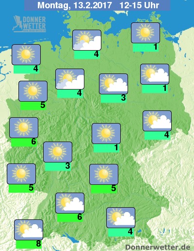 Heute Nachmittag scheint die Sonne über sehr großen Teilen des Landes, dabei ist es vielerorts sogar wolkenlos, sonst ziehen auch meist nur lockere Wolkenfelder durch. Im Süden halten sich hier und da auch dichtere Wolken oder es bleibt länger trüb, dabei bleibt es trocken. Die Temperatur liegt bei 1 Grad in der Uckermark und etwa 8 Grad im Breisgau.