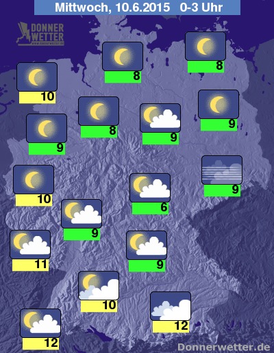 Im weiteren Nachtverlauf klart der Himmel weiter auf, entlang der Weser sowie in den Höhenlagen des Thüringer Walds und Erzgebirges kann sich örtlich auch Nebel bilden. Im Süden überweigt zumeist lockere Bewölkung.