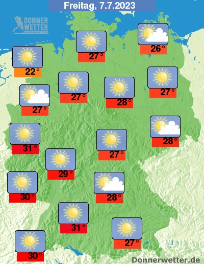 Am Freitag scheint verbreitet die Sonne und es ziehen höchsten lockere Wolken durch, dabei bleibt es trocken. Die Temperatur steigt auf Höchstwerte von 22 Grad an der Nordseeküste und bis 31 Grad in Schwaben.