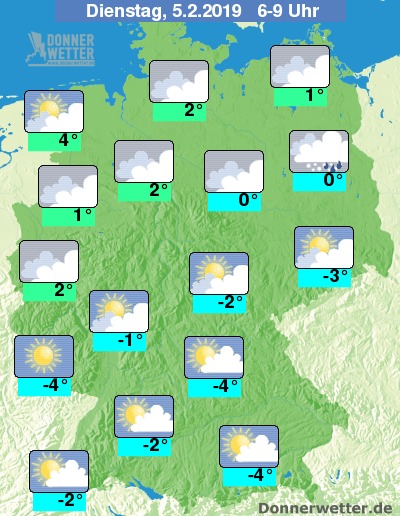 Die Temperaturen sinken auf Tiefstwerte um 3 Grad C in Emden und um -6 Grad C im Alpenvorland.
