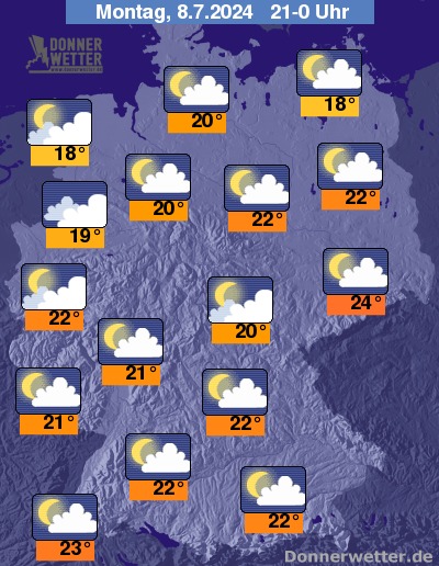In der Nacht zum Dienstag zeigt sich der Himmel über der Nordhälfte gebietsweise dichter bewölkt, es bleibt aber überwiegend trocken. In den übrigen Landesteilen ist es teils locker bewölkt, teils sternenklar und es bleibt trocken.