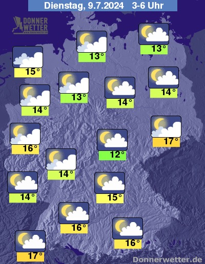 Die Temperaturen gehen in den Frühstunden zurück auf Werte um 17 bis 12 Grad.