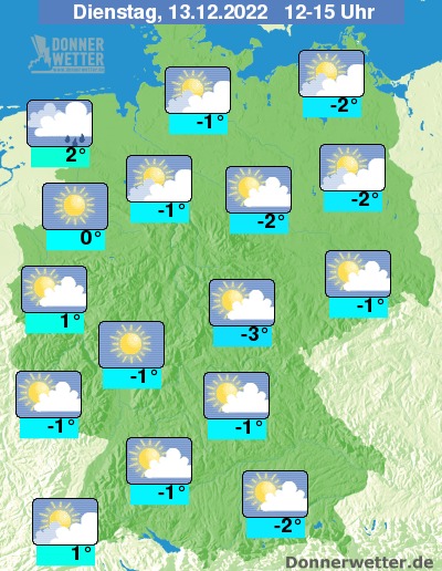 Die Temperaturen erreichen Höchstwerte um -3 Grad im Thüringer Becken und 2 Grad im Rheinland.