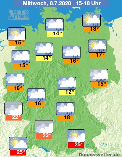 Die Temperaturen bewegen sich unter den dichten Regenwolken nur zwischen 12 und 17 Grad, im Süden und Südwesten wird die 20 Grad - Marke jedoch vielfach deutlich überschritten.