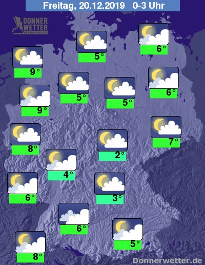 In der Nacht zeigt sich der Himmel über weiten Teilen des Landes locker oder aufgelockert bewölkt, an der Weser kann es gebietsweise auch aufklaren. Es bleibt trocken. Es weht ein meist schwacher Wind aus Ost/Südost; in der Lausitz, im Zittauer Gebirge sowie am Alpenrand sind auch frische bis stürmische Böen möglich.