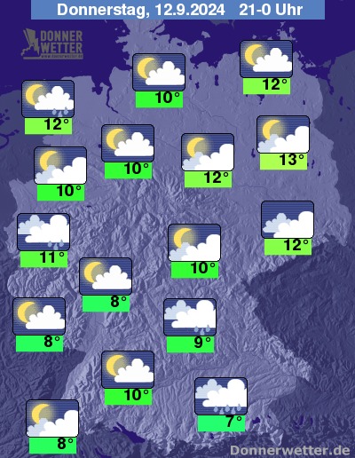 In der Nacht zum Freitag fällt am Alpenrand aus einer geschlossener Wolkendecke anhaltender Regen, die Schneefallgrenze sinkt auf etwa 1.200 Meter. In den übrigen Landesteilen bleibt es bei meist wechselnder oder starker Bewölkung niederschlagsfrei, nur an der Nordseeküste einzelne Schauer und Gewitter.