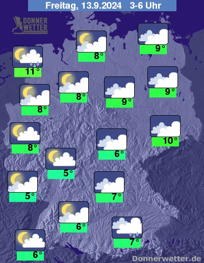 Die Temperaturen gehen im Flachland in den frühen Morgenstunden zurück auf Werte um 11 bis 5 Grad, in den Mittelgebirgen auch Temperaturen unterhalb der 5-Grad-Marke.