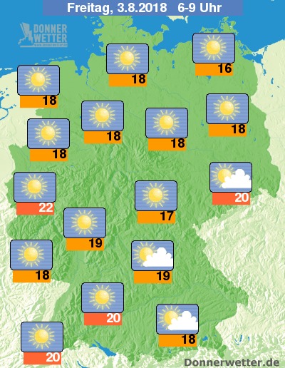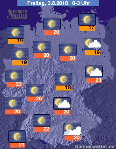 Trotz überwiegend sternenklaren Himmels, lockere Wolken sind meist nur im Osten und Südosten unterwegs, kühlen die Temperaturen nur selten auf Werte unter 20 Grad C ab. Am kühlsten bleibt es entlang der Küsten sowie in den Mittelgebirgen - hier Tiefstwerte um 19 bis 17 Grad C.