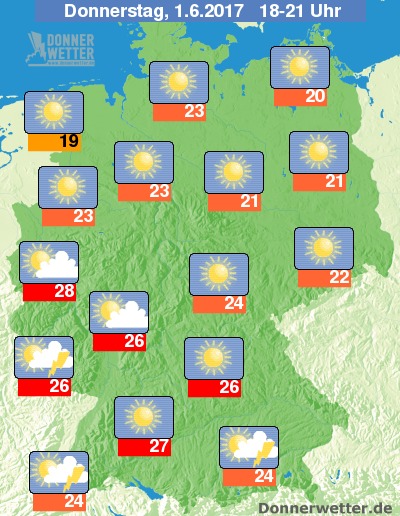 Über Mittag lacht die Sonne fast im ganzen Land von einem strahlend blauen Himmel. Lediglich an den Küsten und in den Mittelgebirgen verdecken zeitweise einzelne Wolken die Sonne. Im Südwesten bilden sich bereits dann erste Quellwolken und das Gewitterrisiko steigt langsam an.