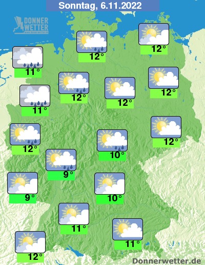 Am Sonntag ist es vor allem im Osten und Südosten zunächst heiter. Im übrigen Bundesgebiet zeigen sich noch zum Teil heitere Abschnitte, oft ist es aber auch schon stark bewölkt oder trüb, jedoch noch trocken. Am Nachmittag setzt im Westen Regen ein, der sich zum Abend auch bis in den Norden und die Mitte des Landes ausdehnt, sonst bleibt es überwiegend trocken. Die Temperatur erreicht 9 Grad im Saargau und bis 12 Grad in der Lausitz. An der Nordsee weht ein teils stürmischer Wind.