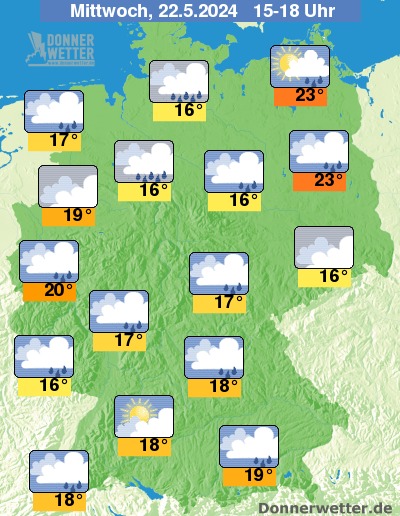 Am Mittwochnachmittag zeigt sich der Himmel wechselnd oder stark bewölkt, dabei muss im Norden und Nordosten gebietsweise mit Gewittern und einhergehendem Starkregen gerechnet werden. Vereinzelt sind auch Unwetter mit Hagel und stürmischen Böen zu erwarten. Auch im südlichen Bergland sind am Nachmittag Gewitter, ergiebiger Regen und Böen möglich.