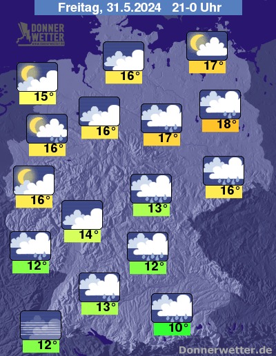 Am Freitagnachmittag zeigt sich der Himmel über weiten Landesteilen stark bewölkt oder es ist bedeckt, am ehesten Lichtblicke gibt es in den nächsten Stunden im Nordosten. Verbreitet muss am Nachmittag mit Schauern und einzelnen Gewittern gerechnet werden, im Süden und Südosten fällt teils ergiebiger Dauerregen. Unwettergefahr!