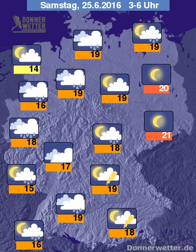 In der Nacht zum Samstag bleibt es im Osten und auch im Südosten meist sternenklar und trocken. Gebietsweise kräftige Schauer und Gewitter bilden sich vom Süden bis nach Westdeutschland und weiter bis in den Norden Deutschlands. Über der Mitte des Landes ist der Himmel überwiegend nur locker, hier und da aber auch stark bewölkt, dabei sind nur selten Schauer und Gewitter möglich. Die Temperatur sinkt auf 21 Grad an der Neiße und bis 14 Grad an der niederländischen Grenze.