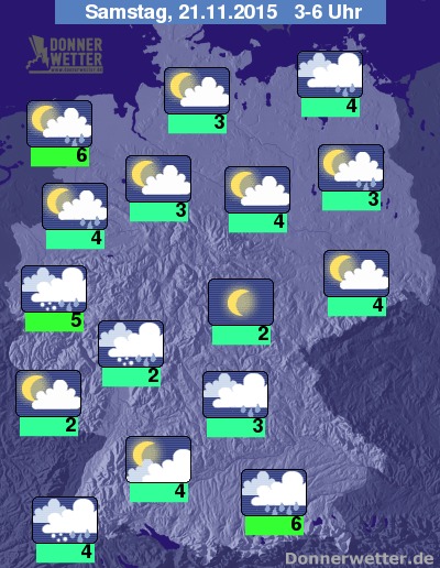 In der Nacht zum Samstag bleibt es sowohl im Süden als auch im Nordosten Deutschlands bei weitgehend dichter Bewölkung, dazu fällt hier zeitweise Regen, örtlich ist auch Schneeregen möglich. Im übrigen Bundesgebiet ist es teils klar, zum Teil ziehen aber auch dichte Wolken durch und es können sich einzelne, hier und da auch mit Schnee vermischte Schauer bilden. Die Temperatur sinkt auf 6 Grad in Ostfriesland und bis 2 Grad am Westerwald.
