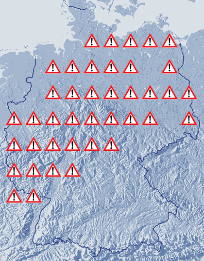 In der Nacht zum Sonntag ziehen sich die Niederschläge immer mehr in den süddeutschen Raum zurück, nur selten fällt im übrigen Land noch Regen, Schneeregen oder Schnee. Am Alpenrand ist teils ergiebiger Regen oder Schneeregen möglich. Im übrigen Land lockert die Bewölkung häufig auf, vor allem nach Osten und Nordosten hin zeigt sich der Himmel auch oft sternenklar. Die Temperatur sinkt auf 5 Grad im Breisgau und bis 0 Grad im Vogtland. Der Wind weht im Norden teils stark, an den deutschen Küsten teils auch stürmisch.