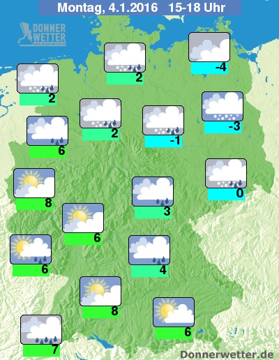 Heute Nachmittag bleibt es nordöstlich einer Linie vom Niederrhein bis zum Bayerischen Wald weitgehend bedeckt und es fällt immer wieder Regen, im Norden und Osten der Republik überwiegend Schnee, dabei besteht erhöhte Glättegefahr! Im Nordosten bleibt es bei meist aufgelockerter Bewölkung trocken. Nach Süden und Westen hin bleibt es oft stark bewölkt, gebietsweise lockert die Bewölkung aber auch auf, hier und da fällt etwas Regen oder auch Schneeregen. Die Temperatur steigt auf -4 Grad in Vorpommern und bis 8 Grad in Stuttgart. Im Norden weht teils starker, in den norddeutschen Mittelgebirgen und an den Küsten teils stürmischer Wind.