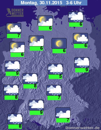 In der bevorstehenden Nacht lockert die Bewölkung im Norden und Westen häufig auf und der anfangs teils kräftige Regen klingt meist rasch ab. Über der Südhälfte Deutschlands und vom Osten bis zum Nordosten des Landes bleibt es jedoch meist bedeckt und es fällt teils kräftiger und ergiebiger Regen. Die Temperatur sinkt auf 9 Grad in Stuttgart und bis etwa 5 Grad im Thüringer Becken. An der Nordsee und auf den Bergen sind einzelne Orkanböen möglich, sonst ist es oft stürmisch mit zum Teil schweren Sturmböen.