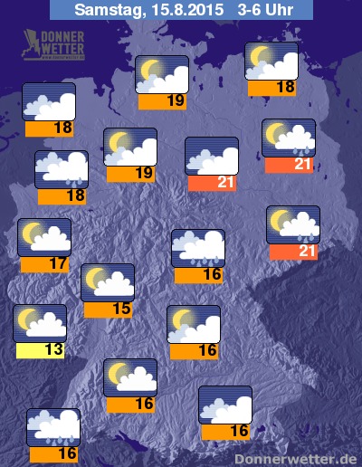 In weiten Teilen der Republik sind in der zweiten Nachthälfte Schauer zu erwarten. Nordöstlichen Teil Deutschlands sind meist Schauer zu erwarten. Vor allem im Südwesten und an den Küsten lockern die Wolken bis zum frühen Morgen hin aber häufig auf und es bleibt überwiegend trocken. Die Temperaturen sinken auf Werte um um 23 Grad C in der Sächsischen Schweiz und um 15 Grad C im Saarland.