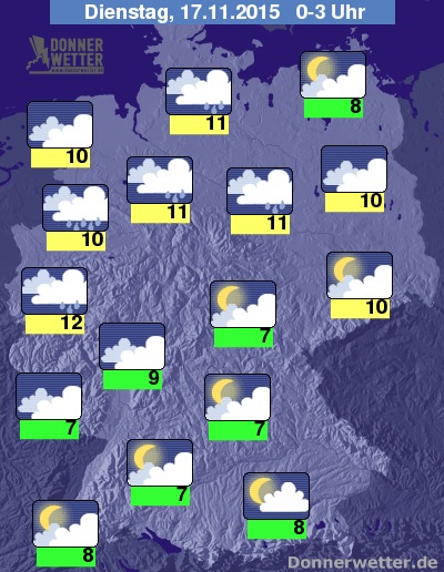 Mit zeitweiligen Schauern geht es für den Norden Deutschlands auch in den Dienstag. Im Süden bleibt es zwar trocken, die Bewölkung nimmt hier aber bereits vielerorts zu. Die Temperaturen erreichen Werte um 12 bis 7 Grad C.