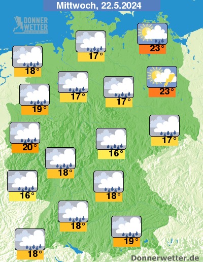 Am Mittwoch fällt zunächst vom Nordwesten bis in den Südosten teils noch schauerartiger Regen, der im Tagesverlauf auch auf den Nordosten übergreift. Auch lokale Gewitter sind möglich, teils besteht Unwettergefahr! Auch im Süden und Südosten sind heute bei wechselnder oder starker Bewölkund zeitweise Schauer und Gewitter möglich.