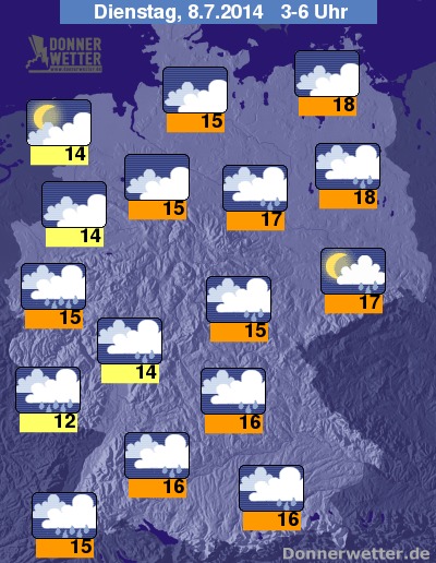 In der Nacht zum Dienstag bleibt der Himmel überwiegend bedeckt und es fällt vielfach, zum Teil gewittriger und ergiebiger Regen. meist trocken bleibt es voraussichtlich im Nord- und Ostseeumfeld. Die Temperatur sinkt auf sehr milde 18 Grad in Berlin und etwas frischere 12 Grad im Pfälzer Wald.
