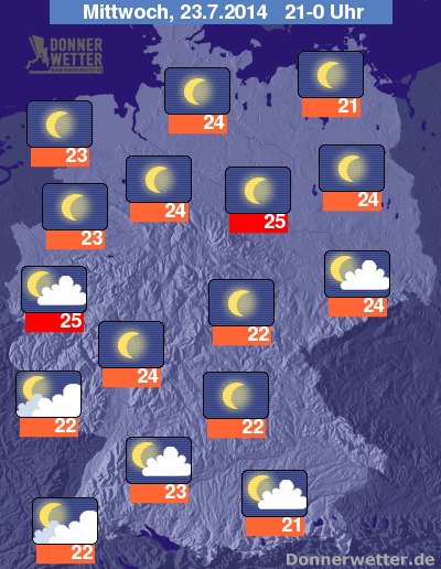 Am Abend zeigt sich ein verbreitet sternenklarer Himmel. Im Süden und in Teilen von Sachsen und des Mittelrheins können auch ein paar dichtere Wolken durchziehen, diese bringen allerdings nur selten etwas Regen, es bleibt weitgehend trocken. Die Temperatur liegt bei 25 Grad in Dessau und um 21 Grad an der Müritz.