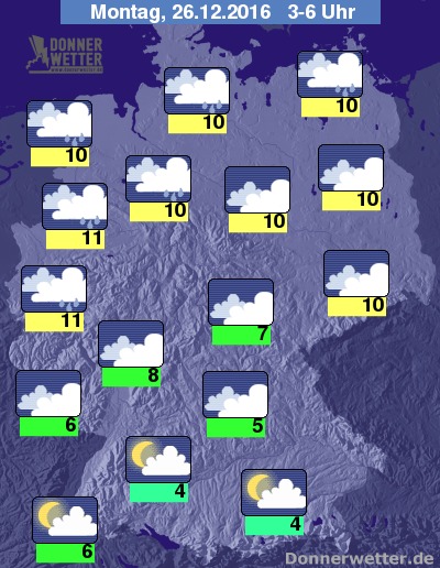 In der Nacht zum Montag zeigt sich der Himmel über Süddeutschland verbreitet locker oder aufgelockert bewölkt, dabei bleibt es trocken. Weiter nach Norden hin bleiben die Wolken dagegen dicht und vor allem im Norden und Westen fällt zudem zeitweise Regen. Die Temperatur sinkt auf 11 Grad in Köln und bis 4 Grad in München.