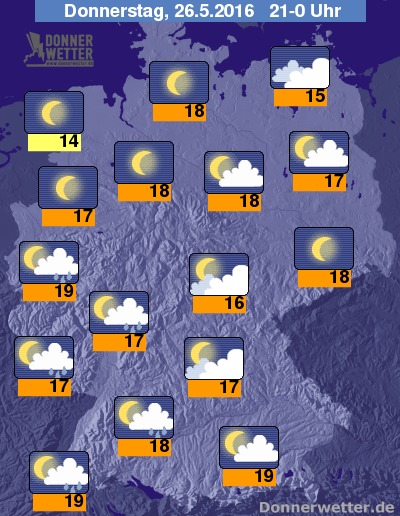 In der ersten Nachthälfte klart der Himmel im Nordwesten des Landes auf, im Südwesten können bei lockerer Bewölkung einzelne Schauer fallen. Entlang und östlich der Mittelgebirge bleibt es bei wechselnder Bewölkung meist trocken, um 19 bis 14 Grad C.