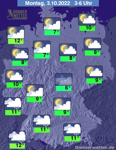 In der Nacht zum Montag fällt im Süden und Südwesten bei dichten Wolken weiterhin, teils länger anhaltender Regen. Weiter nach Norden und Osten hin zeigt sich der Himmel mehr und mehr aufgelockert oder locker bewölkt, dazu bleibt es trocken. Die Temperatur sinkt auf 12 Grad in Freiburg und 6 Grad in Erfurt.