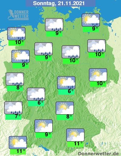 Am Sonntag zeigen sich im Süden oft Aufheiterungen, teils ist es aber auch trüb, dabei bleibt es trocken. Im übrigen Land ziehen überwiegend dichte Wolken durch, jedoch sind auch vereinzelt Auflockerungen möglich, gebietsweise fällt jedoch Regen. Die Temperatur erreicht 6 Grad in Wiesbaden und bis 11 Grad in München.
