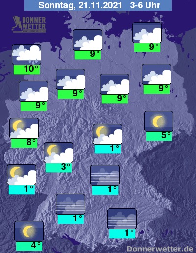 In der folgenden Nacht halten sich über der Nordhälfte weitgehend dichte Wolken, dabei fällt hier und da auch etwas Regen. Im Süden ist es meist sternenklar oder gering bewölkt, lokal bildet sich Nebel. Im übrigen Land ist es teils locker, teils stark bewölkt und dazu trocken. Die Temperatur sinkt auf 10 Grad an der Nordsee und bis 1 Grad in Oberbayern.